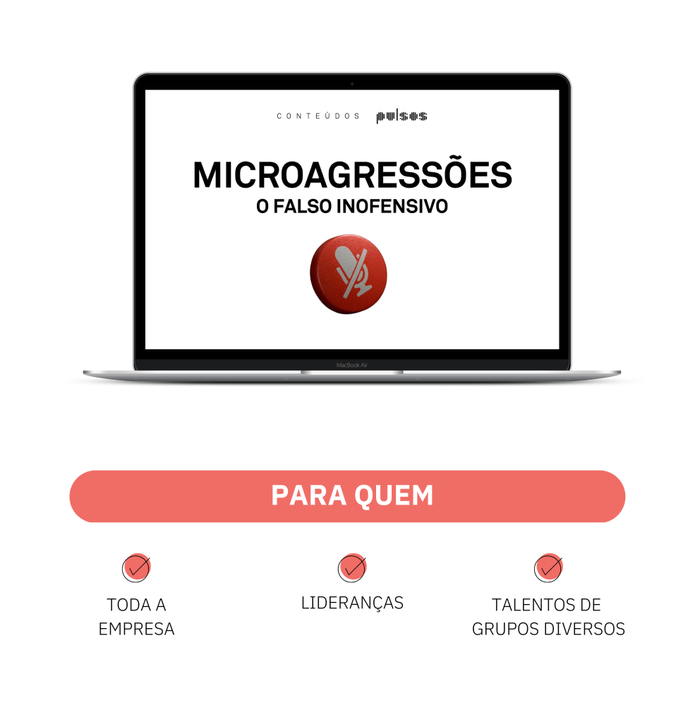 No conteúdo “Microagressões: O Falso Inofensivo”, as pessoas compreenderão em profundidade do que se tratam as microagressões, seus subtipos, seus efeitos e quais as estratégias para reagir a elas, combatê-las e, principalmente, eliminá-las de nossas relações.