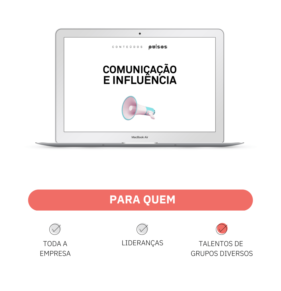 No conteúdo “Comunicação e Influência”, participantes se aprofundarão na compreensão de mecanismos sociais que determinam e influenciam nossa comunicação interpessoal e como adaptá-los de forma mais eficiente à sua própria realidade pessoal e contexto de trabalho.