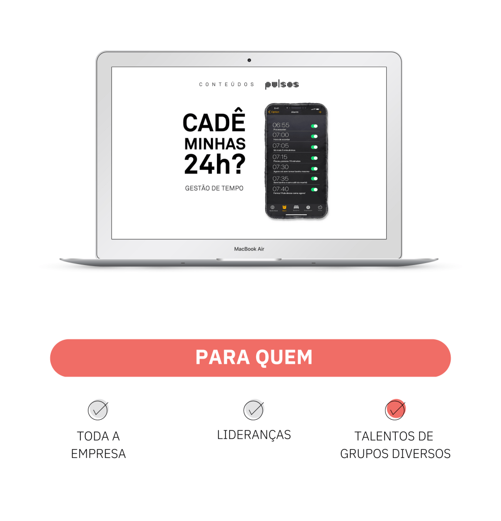 No conteúdo “Cadê Minhas 24h?”, pessoas participantes aprenderão a metodologia C.A.S.I.O. de autogestão de tempo, alterando o foco da produtividade vazia para a qualidade de vida e trabalho saudável.